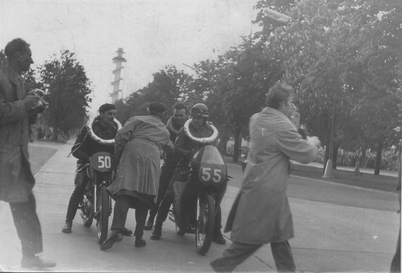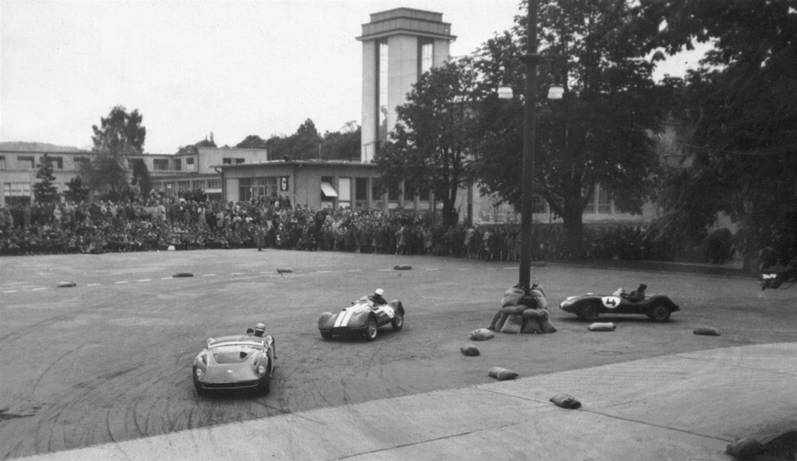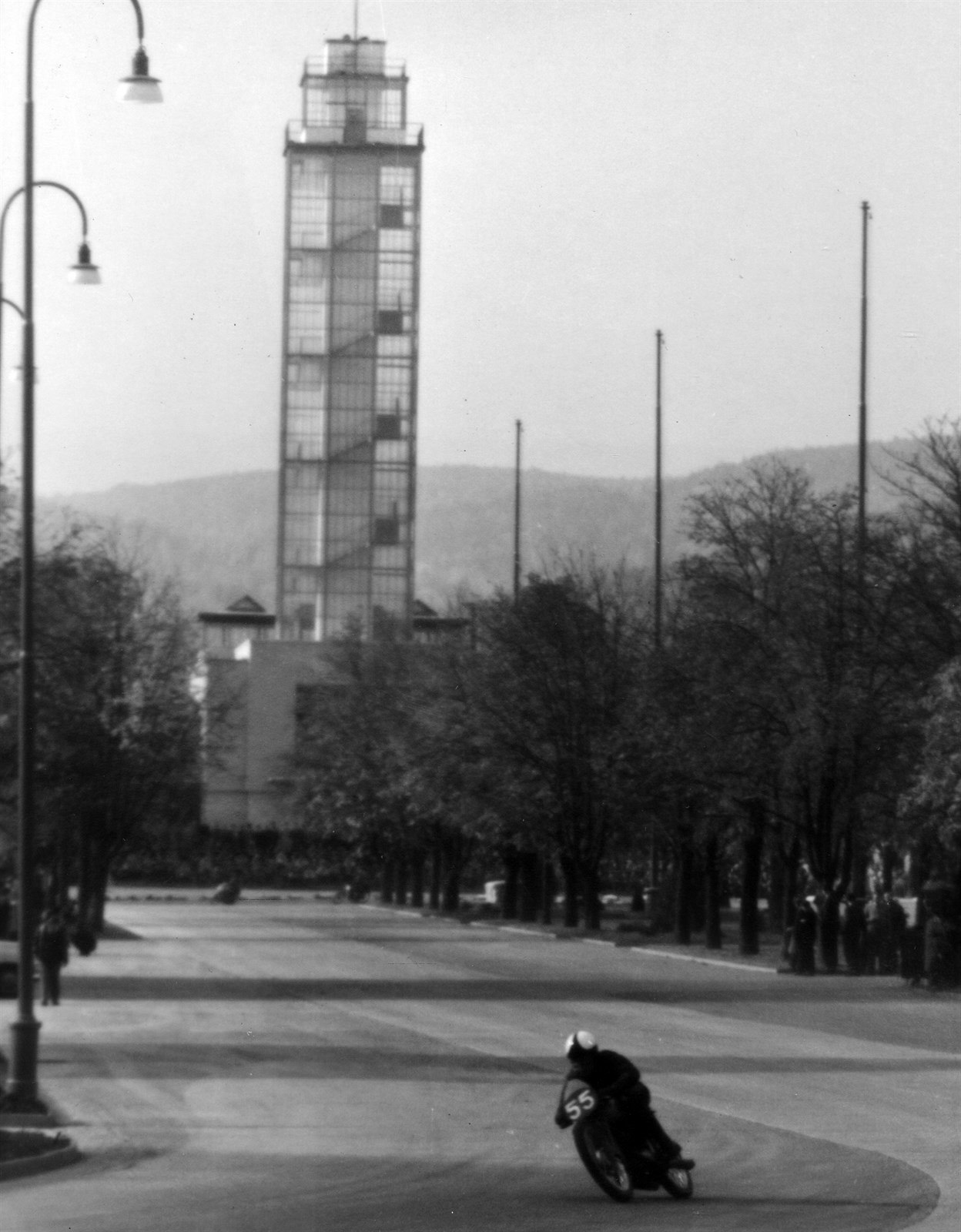 Motocyklové závody v roce 1959, v pozadí je dosud stojící věž u pavilonů G.