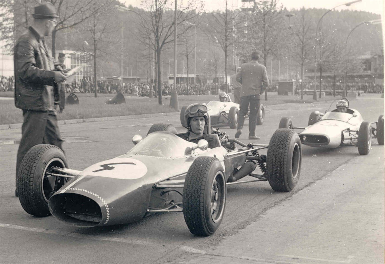 Otto Buchberger před startem závodu v roce 1967. S formulí Drak II vlastní konstrukce dojel v konkurenci továrních škodovek na třetím místě.