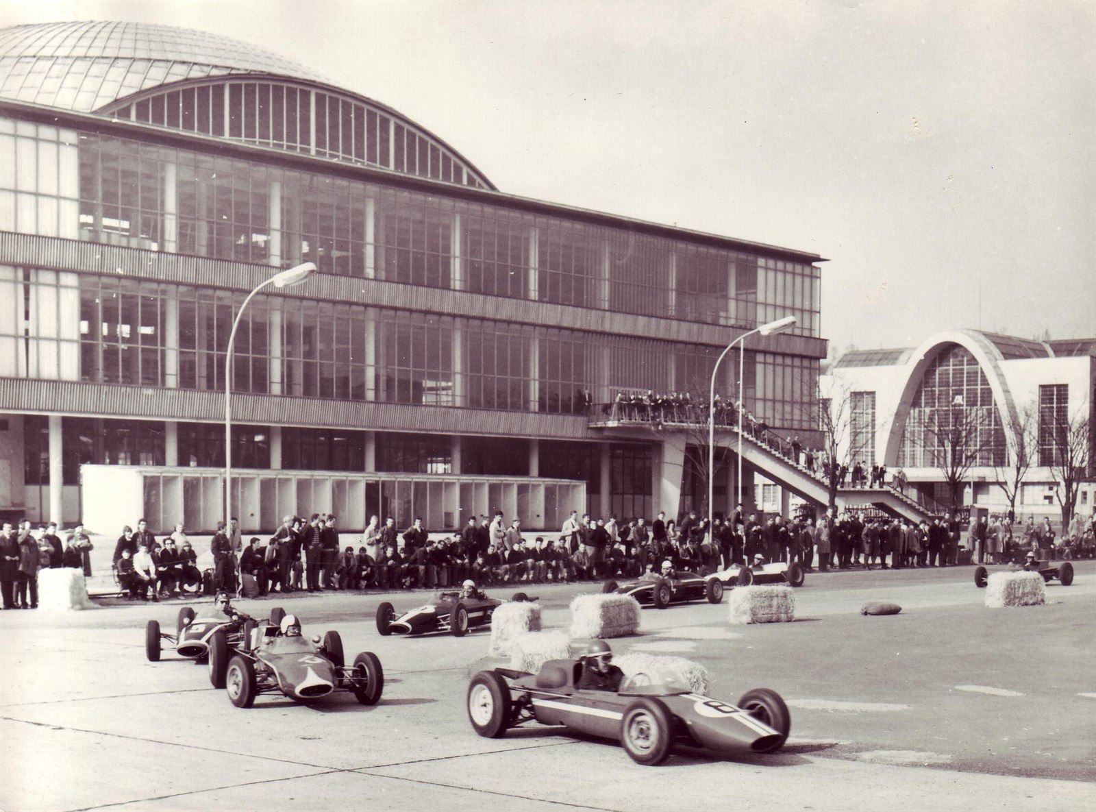 Formule 3 československých závodníků před experimentálním pavilonem Y brněnského výstaviště.