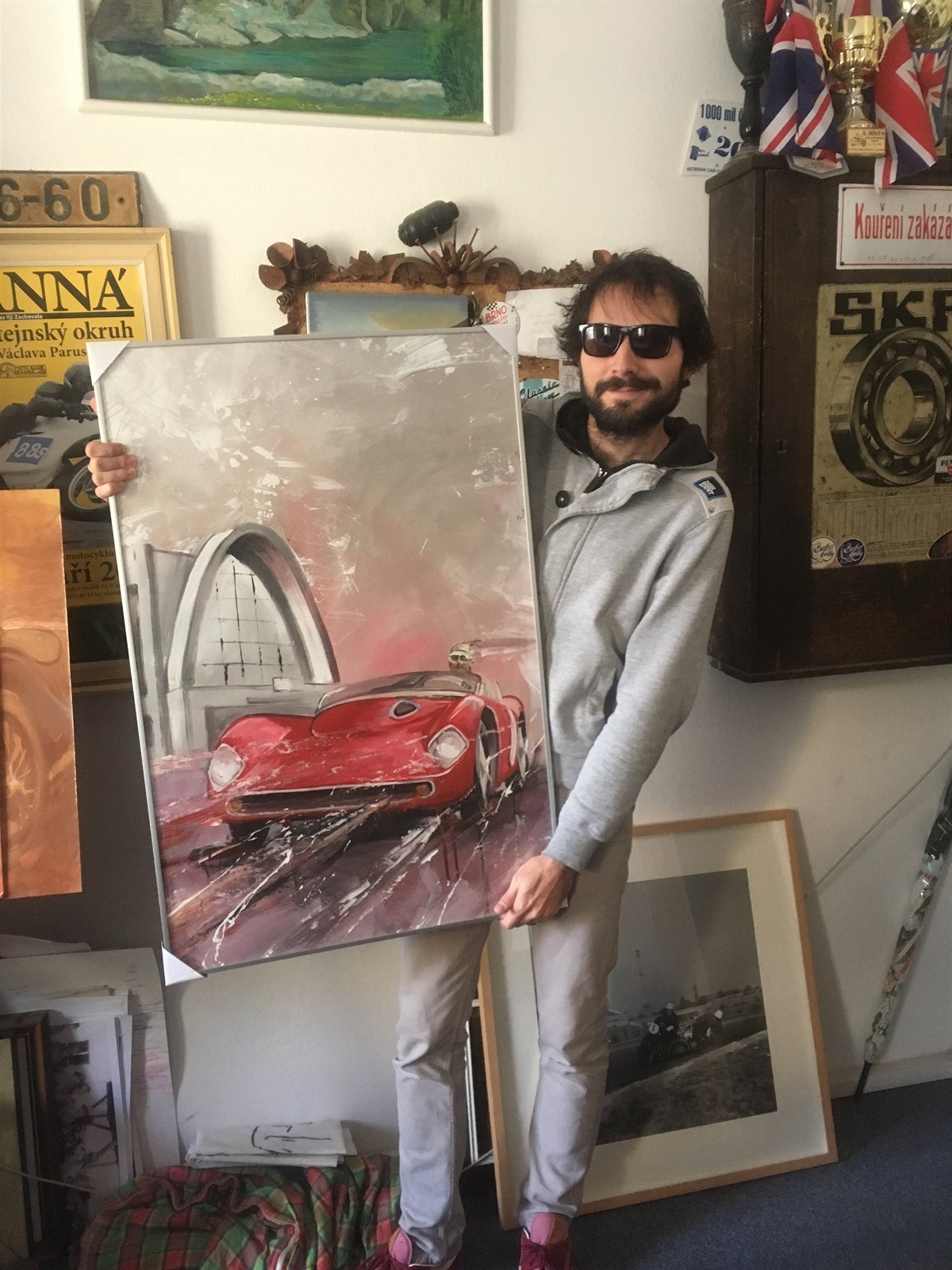 Výtvarník Tom Havlásek se svým návrhem plakátu na závod Brno Revival Mezi pavilony, který se v Brně pojede letos. Na snímku je ikonická Škoda 1100 OHC, v pozadí oblouk pavilonu A brněnského výstaviště.