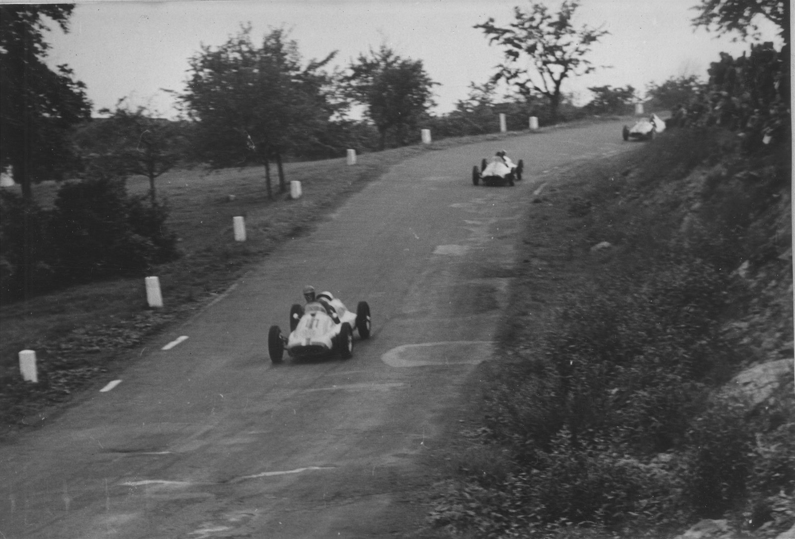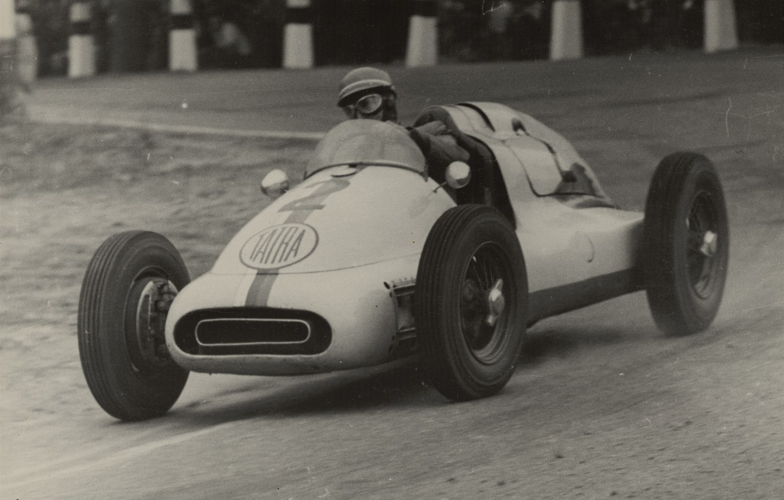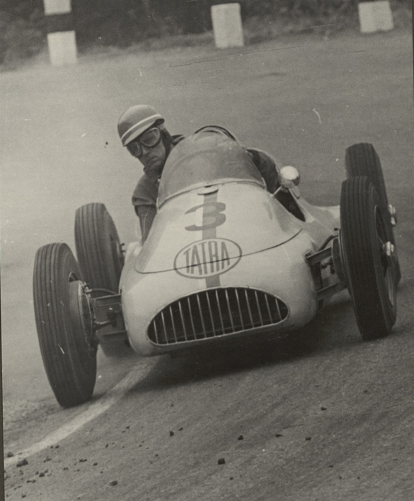 Jaroslav Pavelka s vozem T607-2 projíždí zatáčku u lomu brněnského okruhu v roce 1954. V závodě zvítězil.