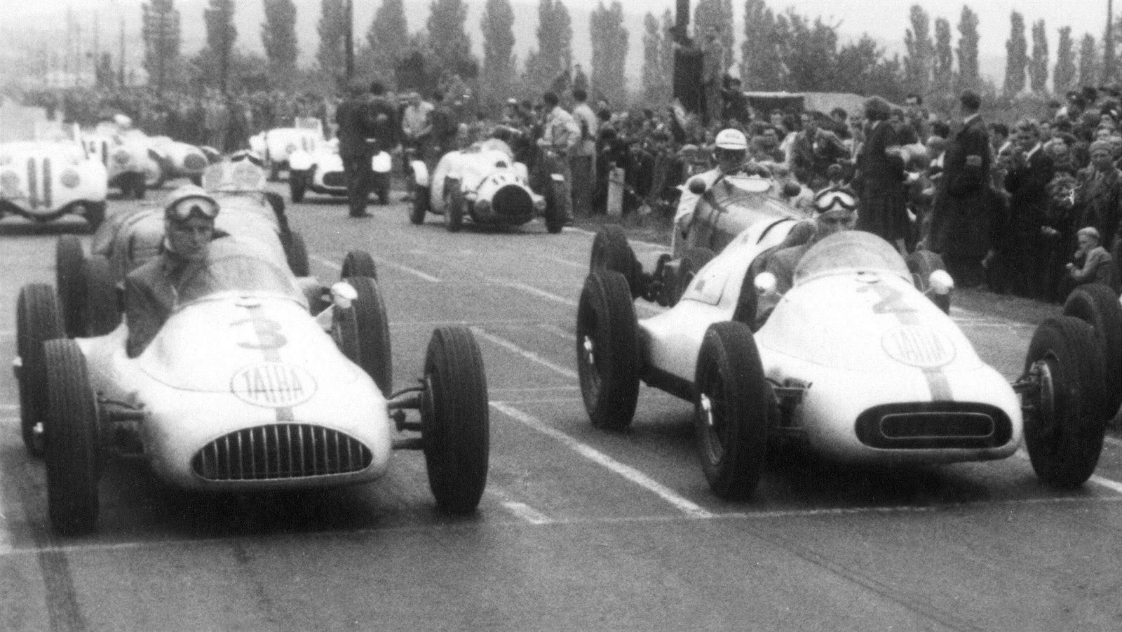 Adolf Veřmiřovský (vlevo) s Tatrou 607 a Jaroslav Pavelka s T607-2 na startu Mladoboleslavského okruhu 1954.