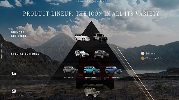 Géčko bude mít bratříčka! A skoro to vypadá, jako by se u Mercedesu rozhodli Čechům svůj špičkový terénní model zpřístupnit. Stuttgartská značka totiž na tiskové konferenci ke svému produktovému plánu zveřejnils obrázek, který ukazuje celou strategii třídy G, kde jsou kromě produkčních modelů vidět i speciální projekty a také mnohem dostupnější model s malým písmenem „g“.