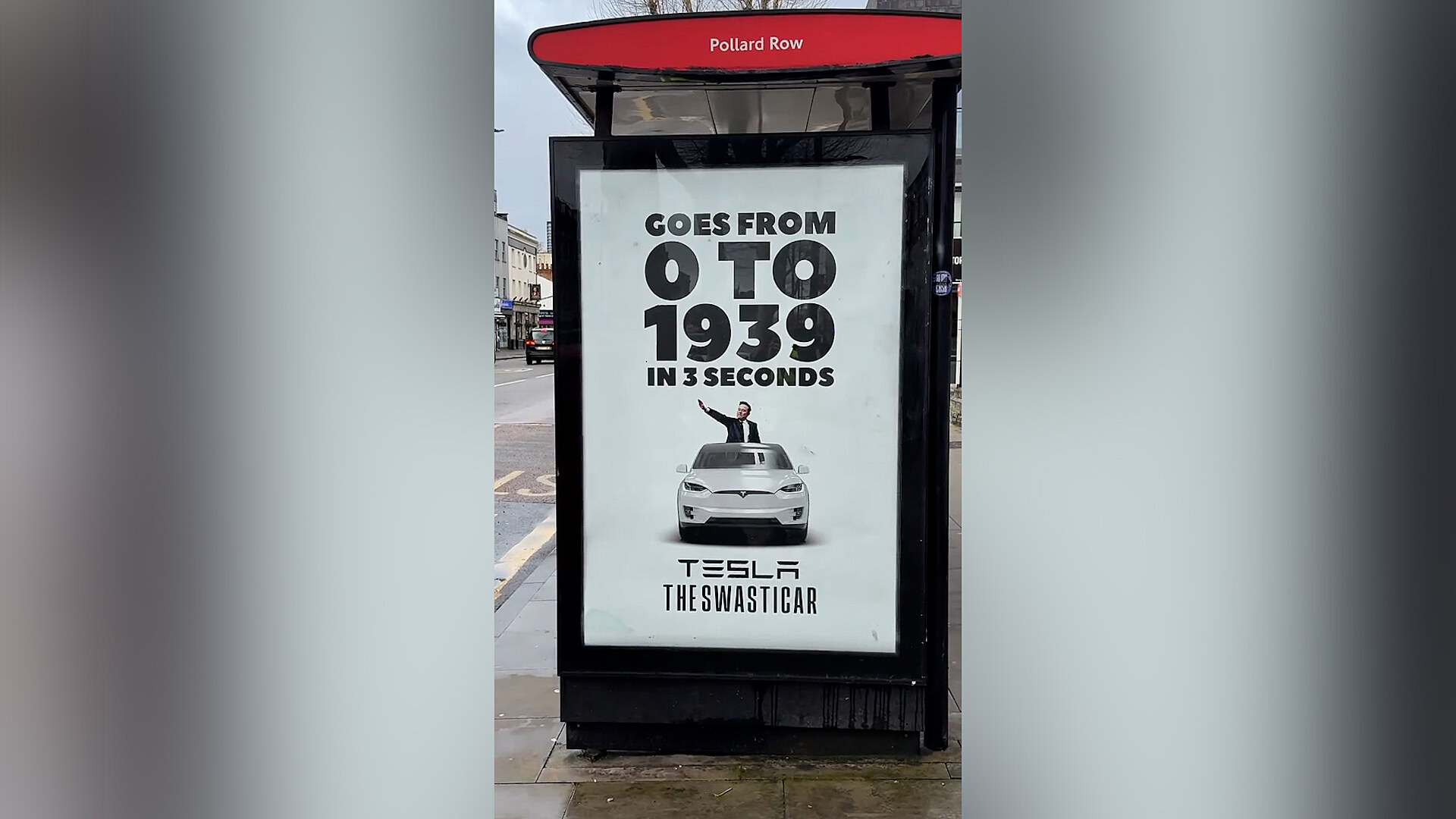 Britská skupina odpůrců Elona Muska ve virálním videu připomíná, že Musk použil známý nacistický pozdrav na inauguraci Donalda Trumpa. Mladík vyvěšuje do reklamního panelu přístřešku autobusové zastávky plakát s nápisem „Z 0 na 1939 za 3 sekundy“, což je odkaz na rok, kdy Německo napadlo Polsko a zahájilo druhou světovou válku. Nápis doplňuje fotka Muska se zdviženou pravicí a heslo „Tesla The Swasticar“.