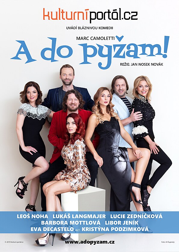 Kristýna Ryška, Lukáš Langmajer, Leoš Noha, Eva Decastelo, Barbora Mottlová, Libor Jeník a Lucie Zedníčková na plakátu k představení A do pyžam!