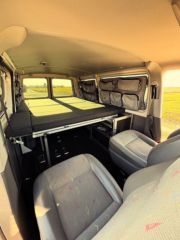 Vestavba je od Rebuild Car, kteří se na takové úpravy specializují. Z jejich rukou vzešla instalace kompresorové lednice, ale i čerpadla na vodu a kuchyně s plynovým vařičem. K tomu přidali postel a matraci na míru, stůl, otočná sedadla, měniče, rozvody pro elektriku a nástavbovou baterii.