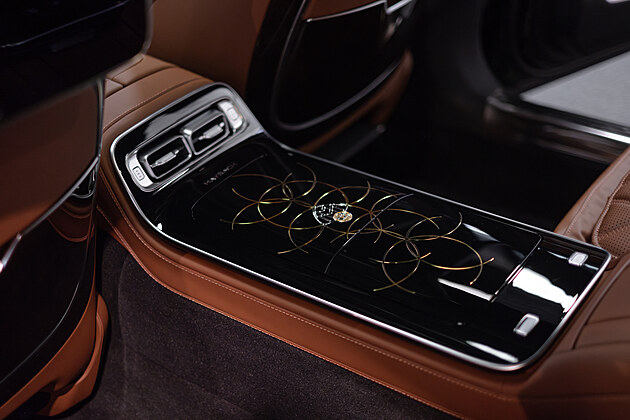 Zadní středovou konzolu zdobí zlatá intarzie. Její vytvoření vyžaduje až sedm pracovních dnů ruční práce. Emblém Maybach s pamětní medailí a číslem „12“ je orámován dvanácti zlatými kruhy.