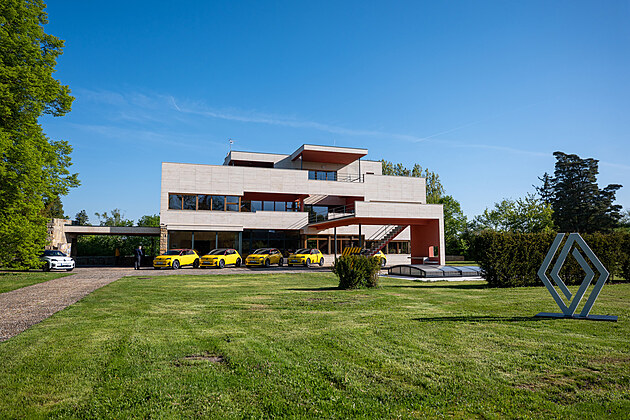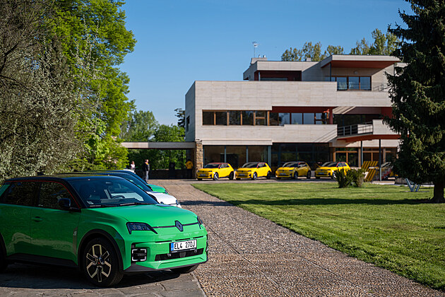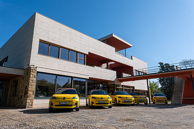 Renaulty R5 E-Tech před Impozantní Volmanovou vilou v Čelákovicích, která je unikátním příkladem pozdního československého funkcionalismu 30. let.