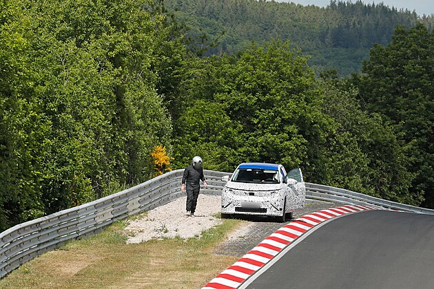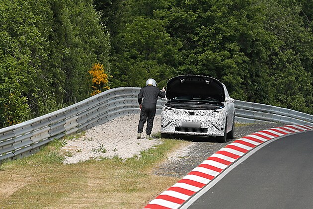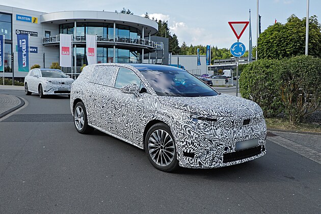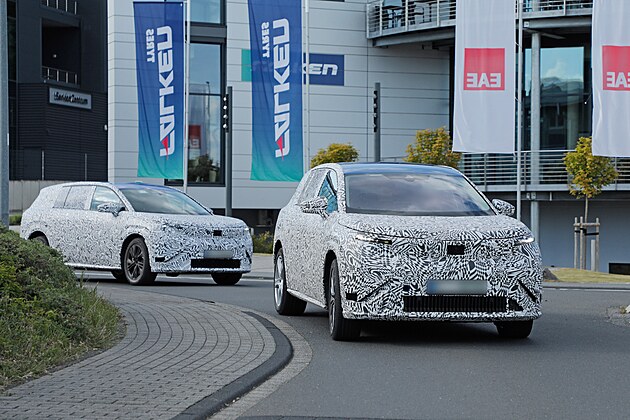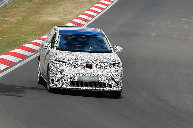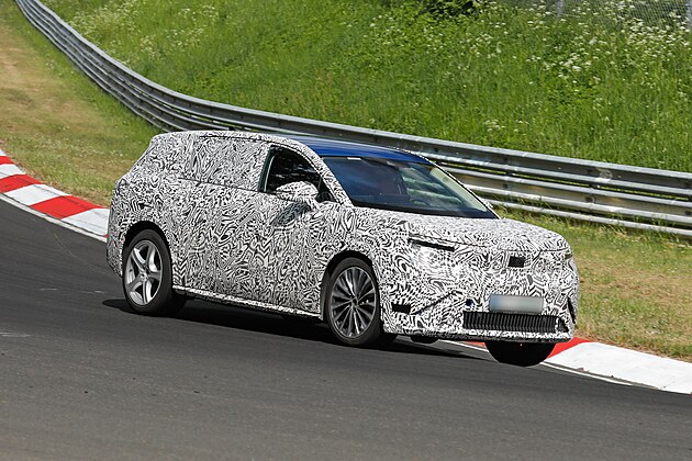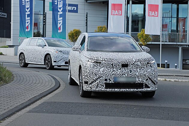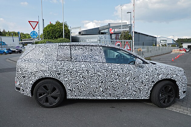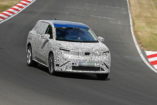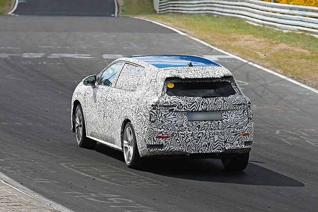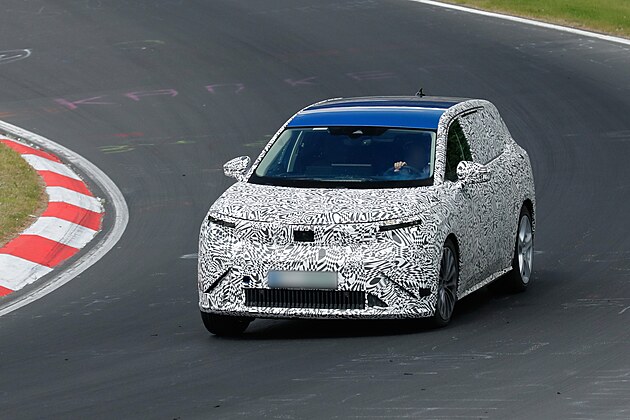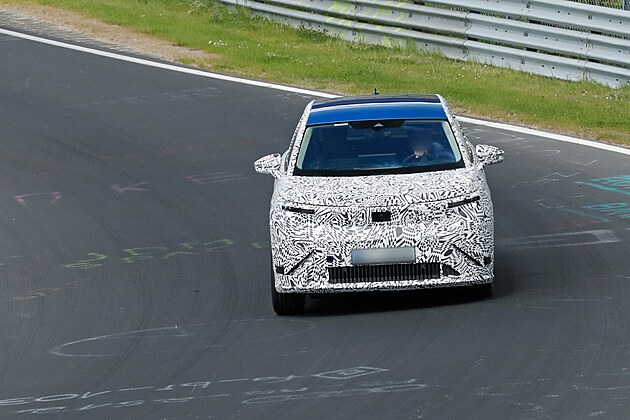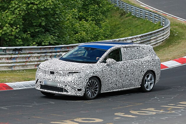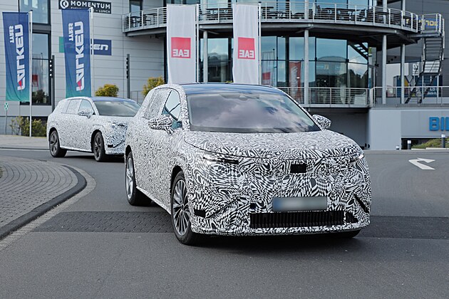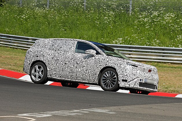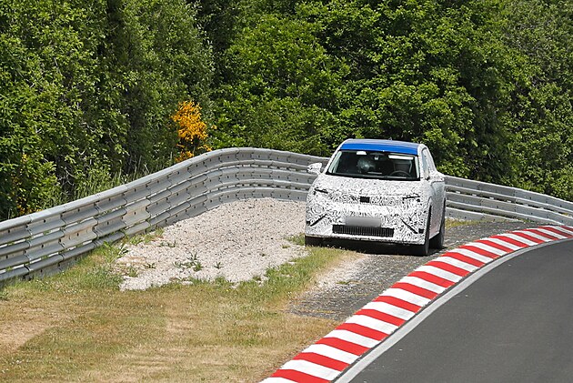 Špionážní snímky prototypu sedmimístného elektrického SUV Škody vycházejícího ze studie Vision 7S z testů na slavném německém okruhu Nürburgring.