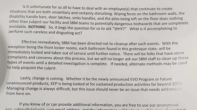 Formou krátkého tiskového vyjádření se dne 6. února 2025 docela oficiálně mohl každý dozvědět, že společnost Stellantis se zavazuje poskytovat svým zaměstnancům bezpečné a zdravé pracovní prostředí. V současné době ovšem vyšetřuje znepokojivé incidenty ve svém závodě na výrobu motorů v Kokomu, v jejichž důsledku byly umývárny v nehygienickém stavu.