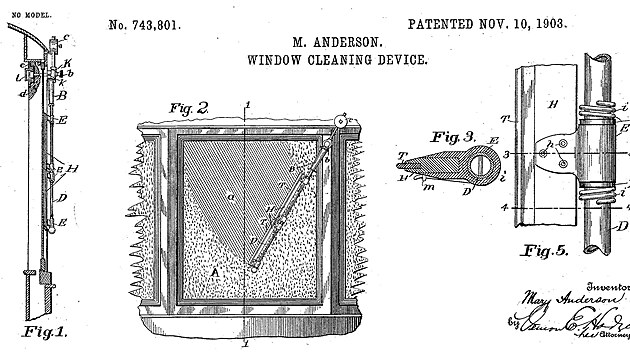 V roce 1903 se Mary Andersonová obrátila na americký patentový úřad, a ten jí 10. listopadu téhož roku udělil patent číslo 748 801 – „Zařízení na čištění oken“.