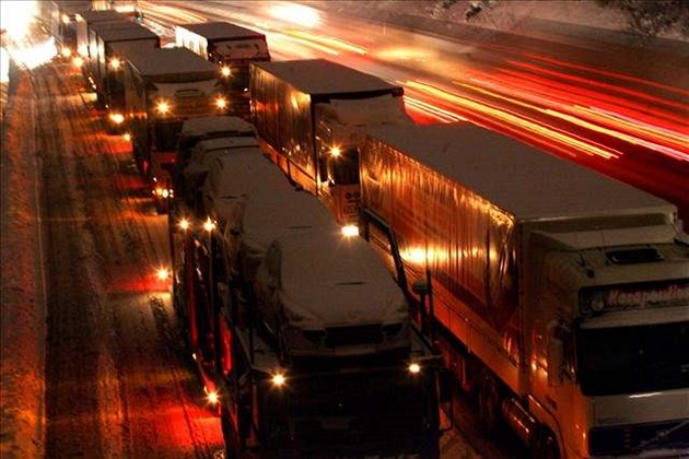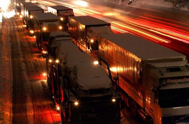 Dva zablokované kamiony na mnoho hodin zastavily provoz na celé dálnici D1 u Větrného Jeníkova ve směru na Prahu. Řidiči ve vozech nocovali. Ilustrační snímek |