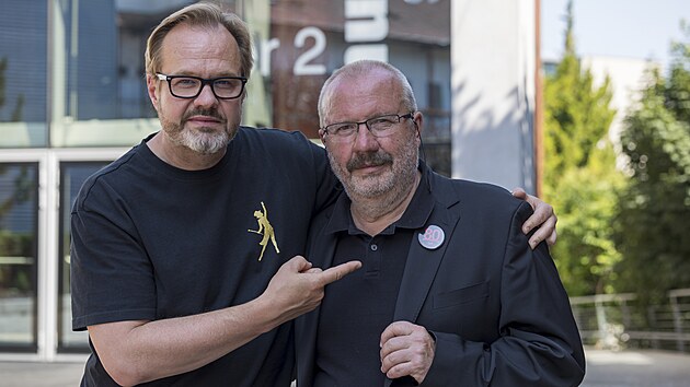 Zpěvák, herec a režisér Petr Gazdík (vlevo) a Stanislav Moša, ředitel a režisér Městského divadla Brno (červen 2025)