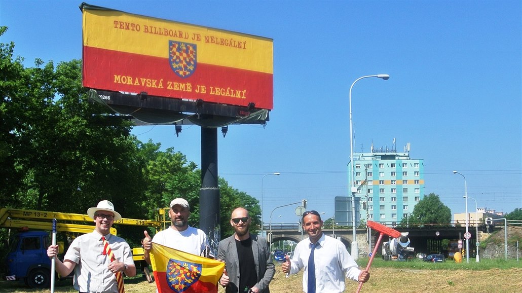 Moravští aktivisté přelepili billboardy v brněnských ulicích Heršpická a Opuštěná a u výjezdu z Brna na Popůvky. „Na jednom byly zbytky plachty, která asi měla reklamu zakrýt, ta ale byla vidět. Na jednom byla česká vlajka a přes jeden byla přehozena látková vlajka,“ popsal Hýsek.