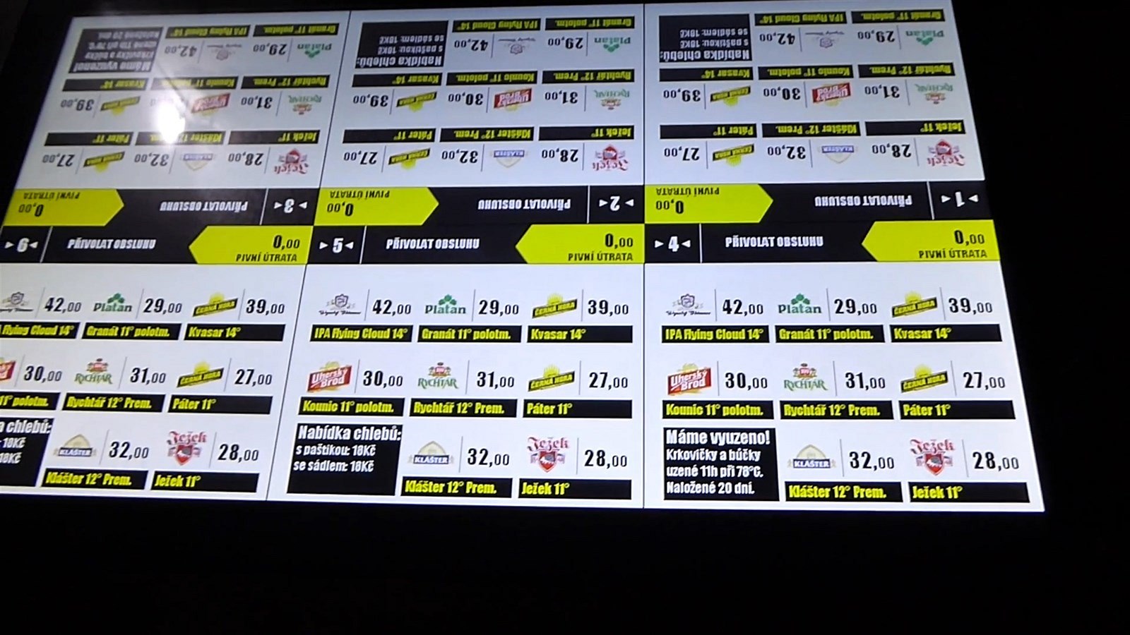 Přímo uprostřed stolů svítí dotykové displeje, na nichž hosté vidí aktuální pivní nabídku i momentální vývoj cen. Stačí poklepat prstem a vybrané pivo už se točí.
