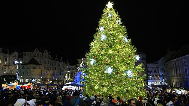 Ozdoby na dvanáctimetrové a 80 let staré jedli na náměstí Svobody, která se rozsvítila v 17 hodin, jsou vyrobené z netypické suroviny v podobě recyklovaných PET lahví.