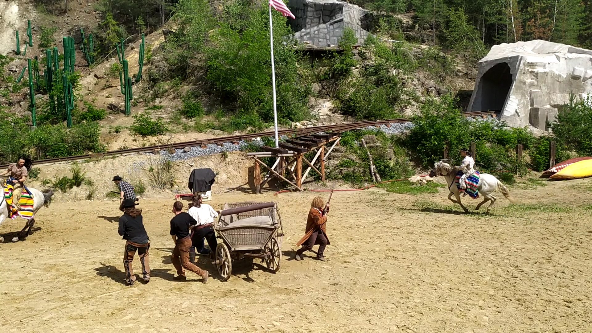 Speciálně pro představení vznikly i unikátní kopie budov z filmu. V boskovickém lomu tak na diváky čeká sídlo Apačů či kolejiště s umělým tunelem. Tím se během vystoupení přiřítí třítunová lokomotiva, která najede do boční zdi jednopatrového saloonu.