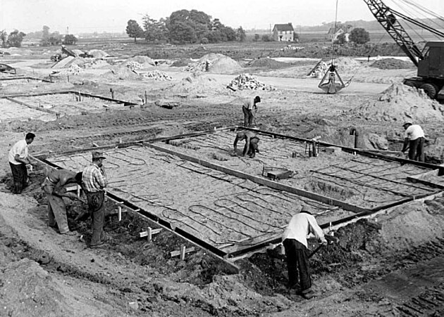Co za tou neuvěřitelně nízkou cenou stálo? Nový způsob výstavby, ne nepodobný výrobní lince v továrně. Žádný z těch domů v Levittownu nestavěla od začátku do konce jedna parta zedníků. Kdepak, ty procesní úkony byly dělené a probíhaly souběžně.