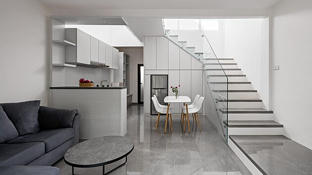 Světlík každého domu odvádí nahromaděný horký vzduch, ale zároveň přivádí nepřímé světlo do velkorysého převýšeného prostoru. Ten představuje centrální bod celého domu, kde je jídelna s kuchyní a obývací pokoj. V horním patře najdete dvě ložnice.