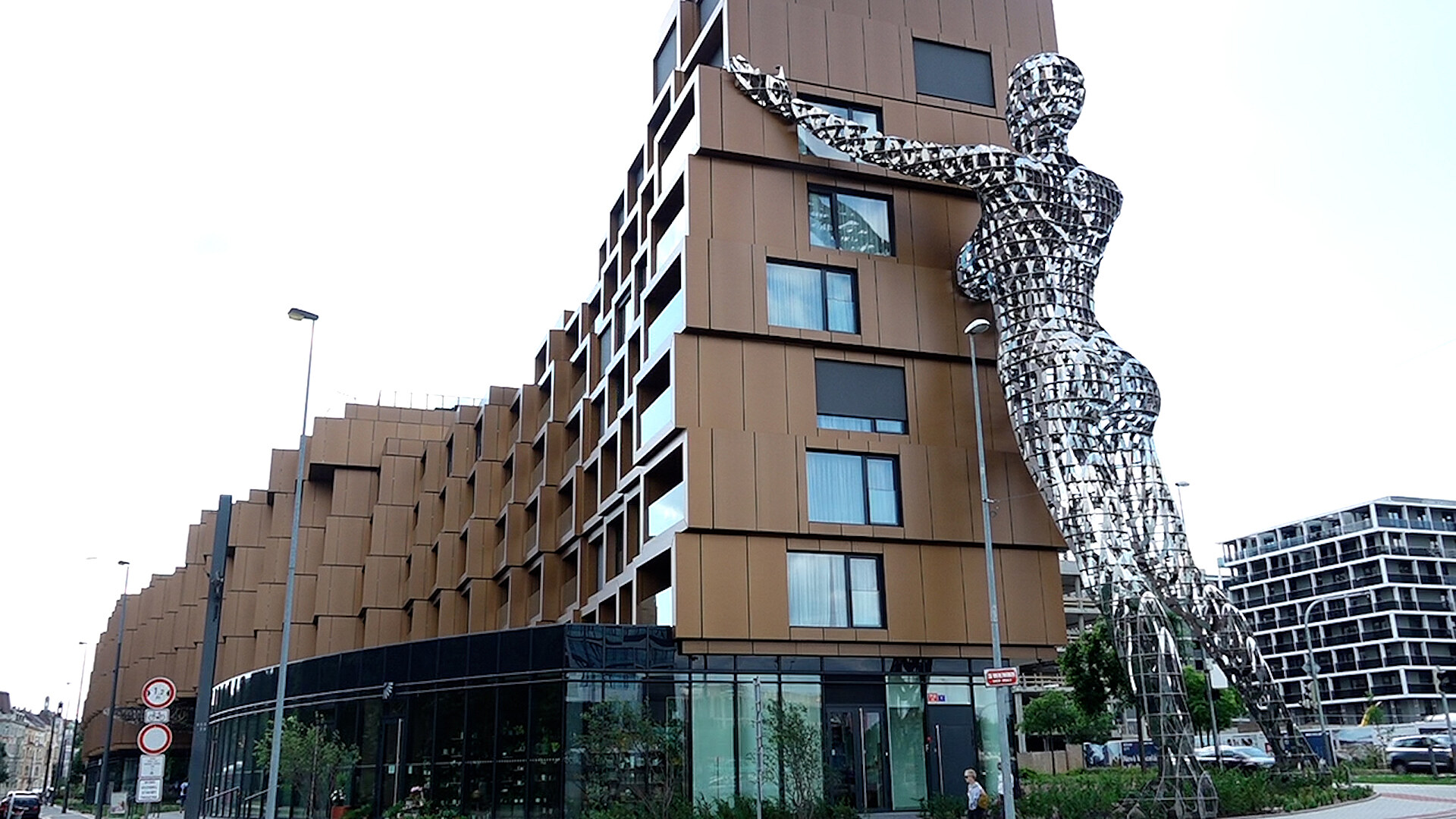 Dům podpírají čtyři monumentální ikonické sochy od českého umělce a sochaře Davida Černého – ruka, noha, dlaň a žena (mýtická první žena Lilith). Měří 24 metrů, váží 35 tun a otáčí hlavou. Pohyblivá bude i ruka, která se drží prsty výduchu metra na nádvoří Fragmentu. Socha nohy a dlaně navíc velmi chytře zakrývají dva nosné sloupy, které podpírají spřaženou mostní konstrukci.