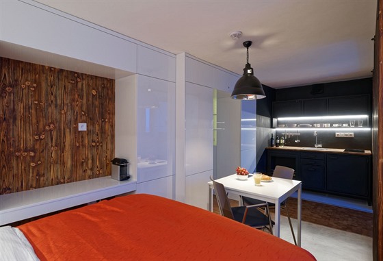 Kompaktní, ale vzdušný prostor vznikl vybouráním všech původních dělících příček. Nyní mu dominuje prostorné dvoulůžko sousedící s pracovním koutem, sofa rozložitelné na další plnohodnotné lůžko a kuchyňská linka z tmavého plechu se zabudovaným krbem.