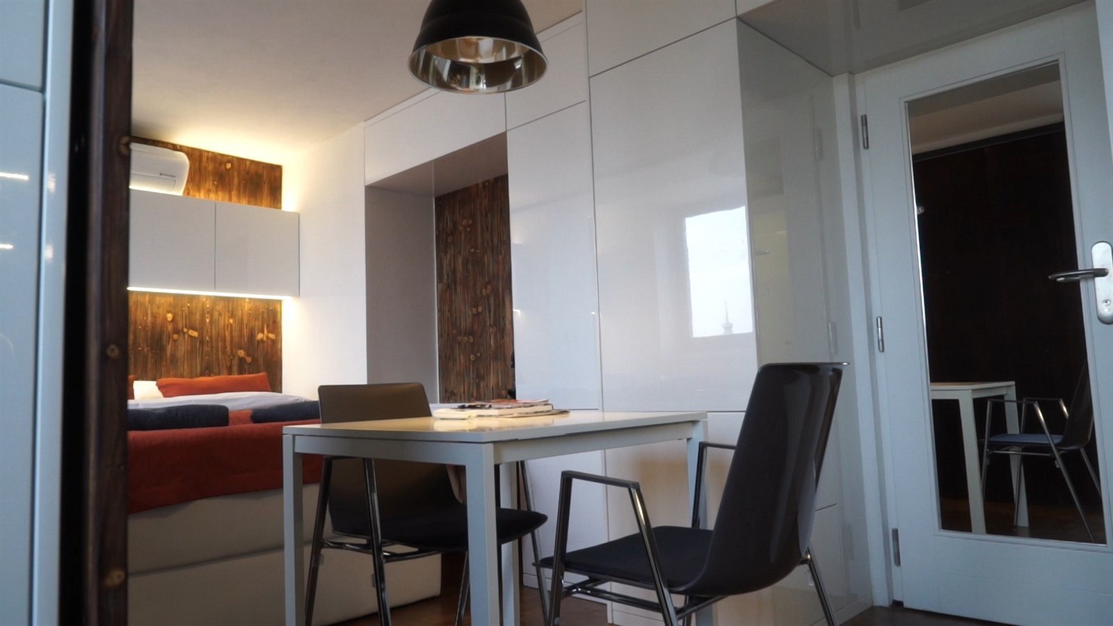 Celému apartmánu dominují masivní posuvná vrata ze stařeného dřeva, díky nimž lze prostor variabilně rozdělovat, a vytvořit tak další samostatnou ložnici, ukrýt do soukromí sprchový kout a WC, nebo naopak jejich odsunutím celý prostor proslunit.