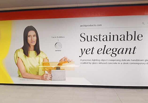 Jak už bylo řečeno v úvodu, na stánek Brokisu zvaly už obrovité bilboardy s portrétem Lucie Koldové (tuto designérku si vyžádali sami pořadatelé) na cestě ke vstupu na výstaviště Rho. Její výraznou tvář doprovázelo na bilboardu heslo Sustainable yet elegante (Udržitelný a zároveň elegantní). Na plakátu byl totiž i jeden z jejích posledních návrhů pro Brokis, svítidlo Overlay.