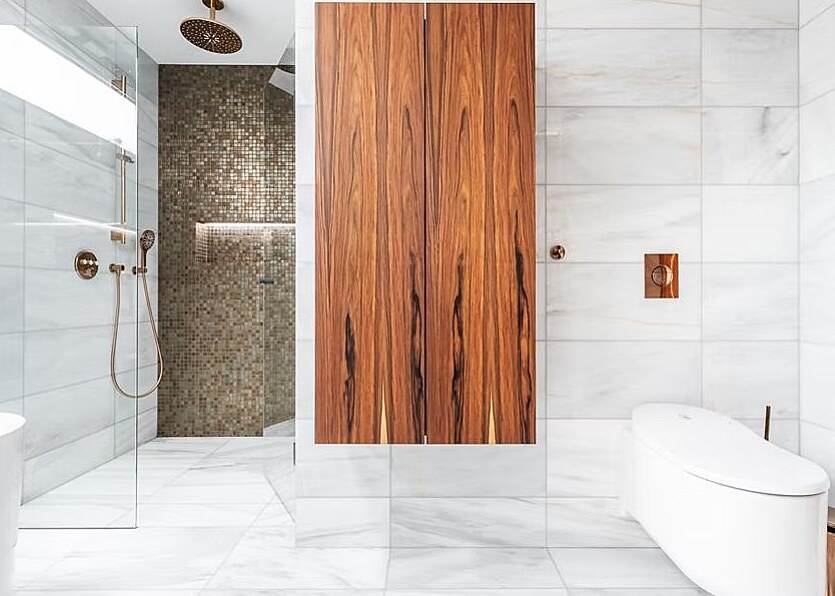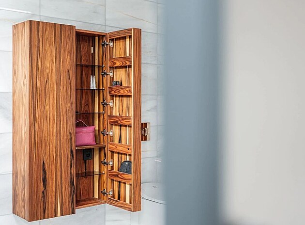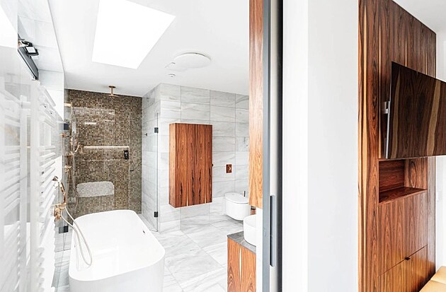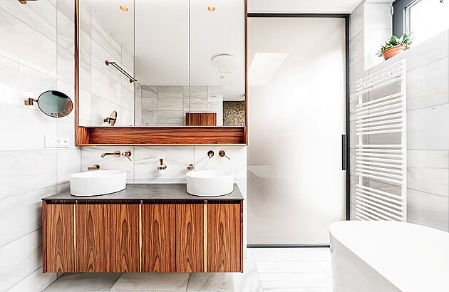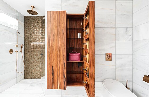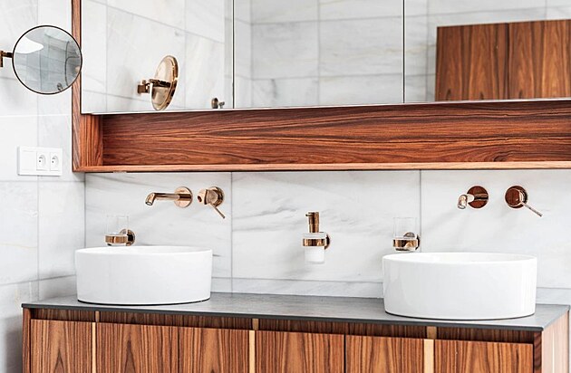 Koupelna už dávno není popelkou, spíš naopak. Důkazem je i luxusní koupelna, kde byly použity výjimečné materiály včetně přírodní palisandrové dýhy, které podtrhují nadčasovou eleganci celého prostoru. Ten nabízí sofistikovaný design a uživatelský komfort. Za návrhem interiéru stojí AAYE atelier, návrh a výrobu nábytku si vzalo na starost studio Le bon design.