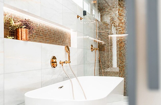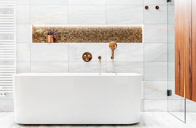 Volně stojící vana představuje luxus i pohodlí, které podtrhuje i nika s osvětlením LED páskem.