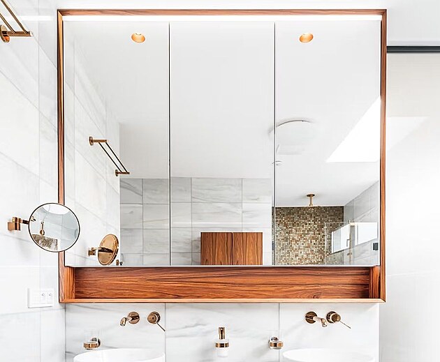 Zrcadlová skříňka má integrované osvětlení, otevřený úložný prostor a precizní pokosové spoje.