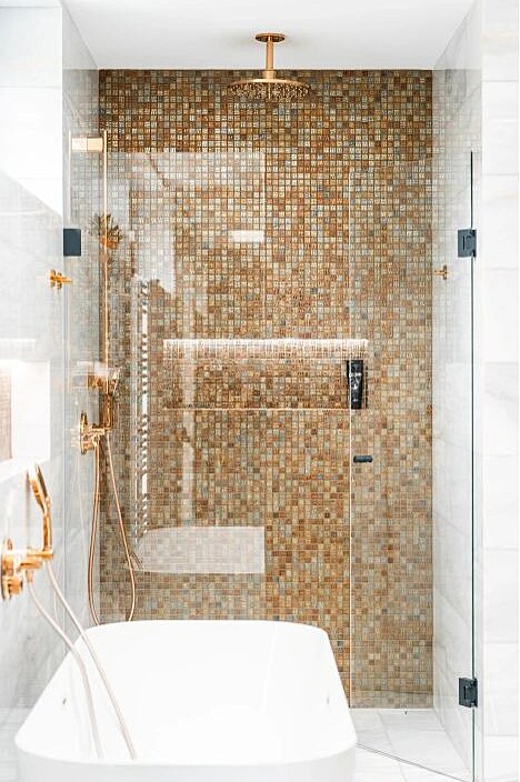 Velký sprchový kout doslova září díky mozaice i použití LED pásku v nice.