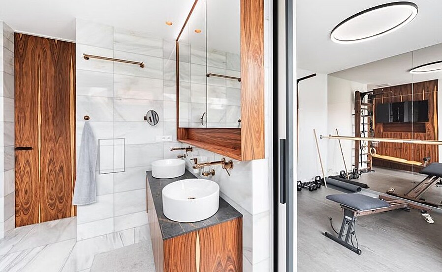 Z koupelny lze projít posuvnými dveřmi do malé posilovny, i zde najdete palisandrovou dýhu.