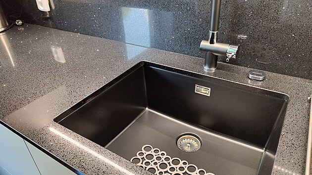 „Jinak to v této kuchyni ani řešit nešlo, aby se zachovala celistvost pohledových ploch a zajistila plná funkčnost myčky,“ upozorňuje designér. Technický kámen pak umožnil pořízení dřezu se spodní montáží, který nenarušuje pracovní prostor a navíc odpadá i potřeba čištění zbytečných spár.