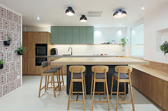 Proto byla vybraná estetická i praktická kuchyňská sestava z velkého nábytkového řetězce. Vizuálně kombinuje něžný a dnes tolik módní mintový odstín prezentovaný na horních skříňkách a medové tóny olšového dřeva. Ze stejného materiálu je středový ostrůvek s varnou deskou, který zároveň rozděluje prostor na funkčních zóny a slouží i jako barové posezení.