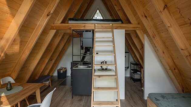 Otevřená ložnice pod stropem je v horní části chatky a cesta k ní vede přes dřevěný žebřík umístěný u stěny rozdělující kuchyni a koupelnu, nad kterými byl tento prostor umístěný. V ložnici pro dva lidi je v zadní části další výhled do přírody skrz trojúhelníkové okénko.