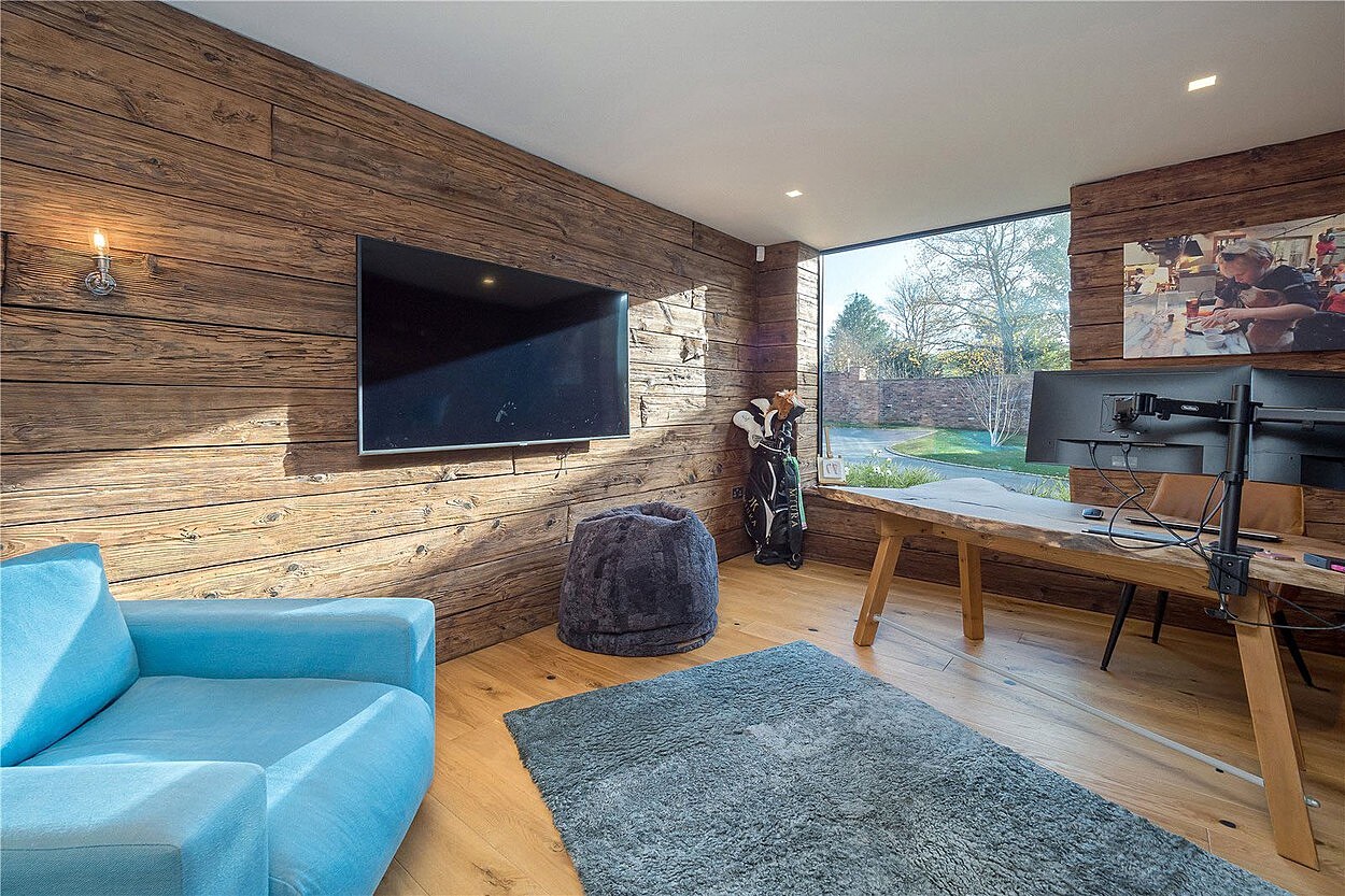 Jednou z místností je i kancelář s krásným výhledem, zajímavým pracovním stolem, pohovkou a televizí.