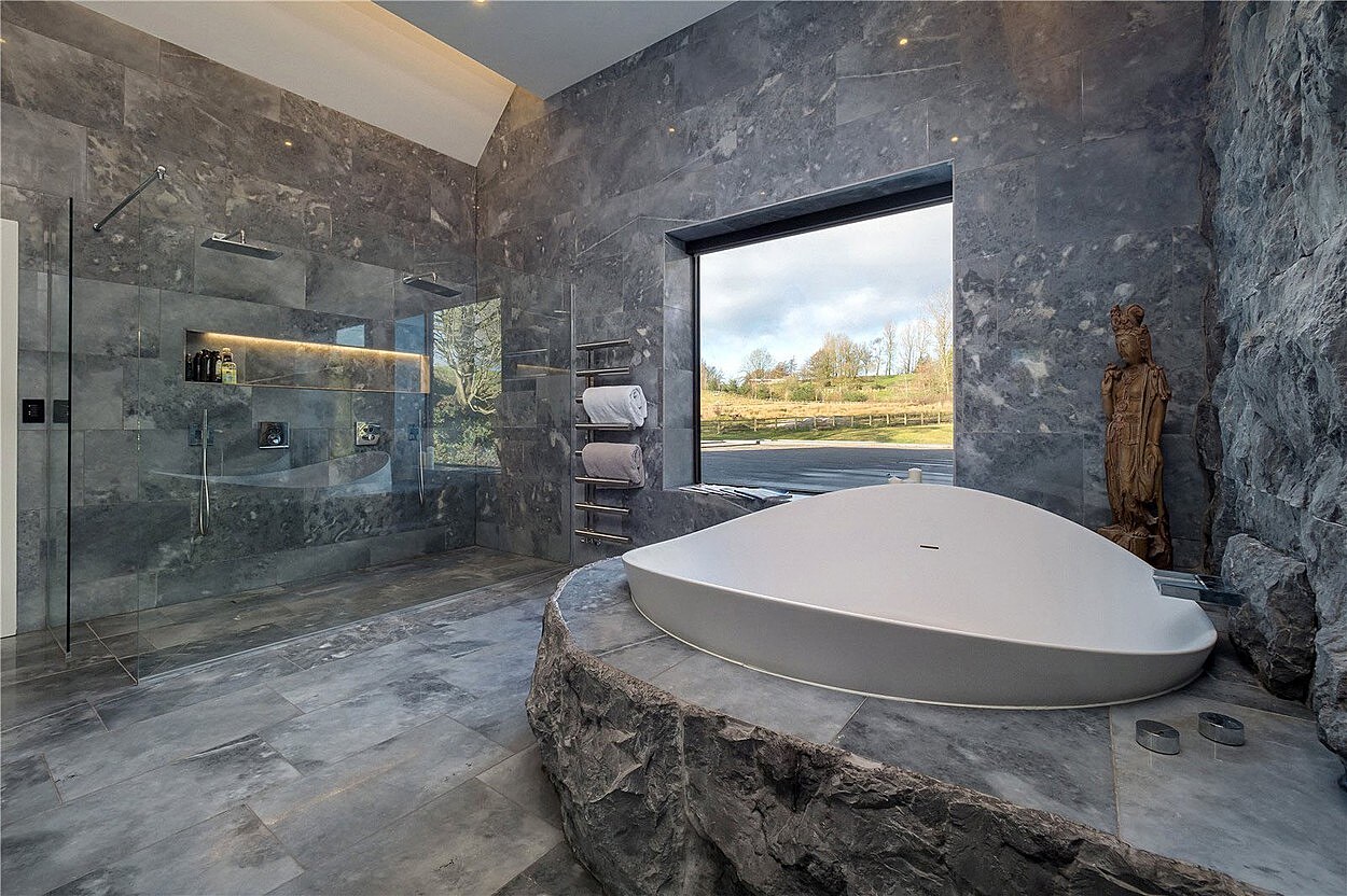 Prostorná vana nabízí výhled do krajiny velkým oknem, díky kterému je v místnosti dostatek přirozeného světla.