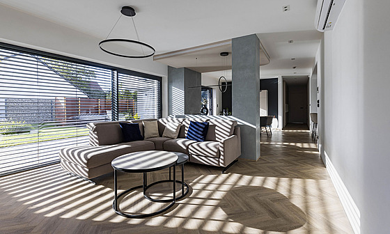 „Naším cílem bylo sladit vše do tónu kašmíru. Tato barva je symbolem klidu, čistoty a nadčasovosti a v tomto interiéru slouží jako základ pro výrazné antracitové prvky a barevné sezonní změny podle nálady obyvatel domu. Příjemnou atmosféru interiéru jsme podpořili i díky použitým svítidlům a jejich nastavení,“ popisuje designérka Gabriela Goldová.