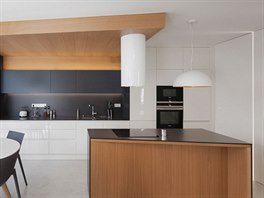 Hlavnímu obytnému prostoru dominuje kuchyňský pracovní ostrůvek v atypickém tvaru, který doplnil kuchyňskou sestavu s pracovní plochou podél celé jedné stěny místnosti. Celý prostor se pak otevírá směrem ven do zahrady.