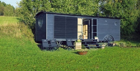 Z maringotky je nádherný výhled do celého údolí. Proto byl stůl s lavicí umístěn proti vstupu. Lavice představuje praktické řešení sezení s úložným prostorem. Pohodlně tu může stolovat až šest osob.