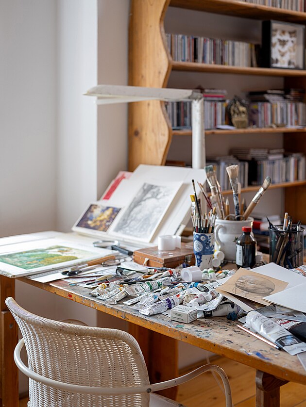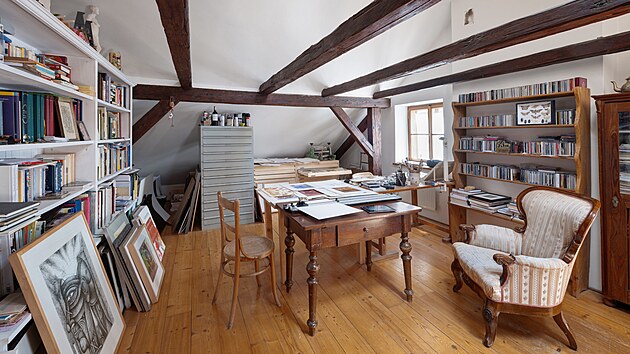 „Bydlení je pro mě zároveň pracovištěm. Proto je důležité, kde bydlím, na co koukám. Ať už to bylo v cizině, v Praze nebo tady. Nahoře mám ateliér, pracuji často do noci, pak tu i přespím. Největší hodnotou je, že jsme nad městem, nad zdejšími stínadly. Večer se z terasy dívám na šindelové střechy, věže, na svítící město připomínající barokní betlém. Turisty slyšíme, ale nevadí nám to. Mají totiž většinou dobrou náladu,“ popisuje Jindra Čapek.
