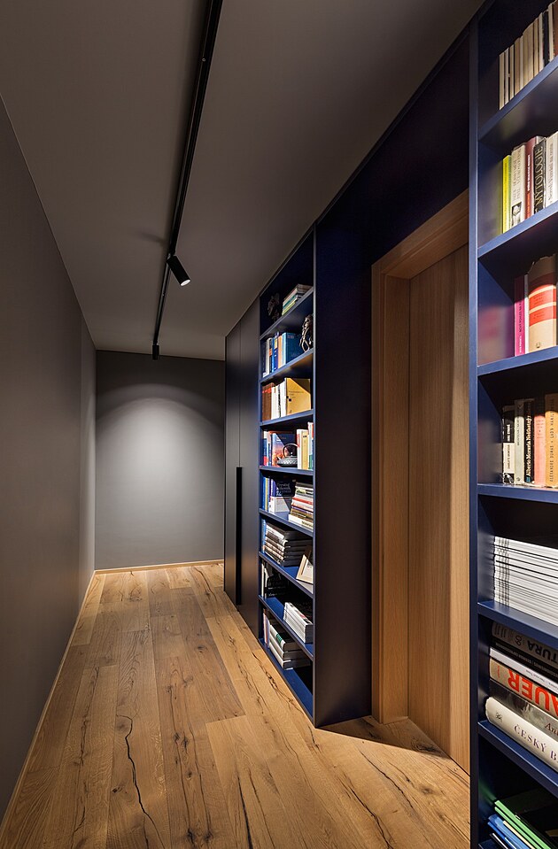 „Velká knihovna byla jedním z mála striktních požadavků, které klient od počátku naší spolupráce měl. Logicky si jí představoval jako dominantu obývacího pokoje. Jenže obývací pokoj byl opravdu malinký a stěží se do něj vešly všechny nezbytné funkce. Za to chodba v druhém patře mezonetového bytu byla zbytečně široká a taky tak trochu nudná. Nová vestavná knihovna proto nakonec parádně zapadla právě sem,“ popisuje architekt Nosek.