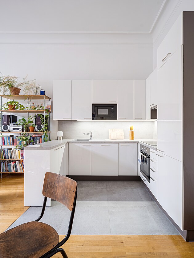 Do kompletně zrekonstruovaného bytu se nastěhoval jako první nájemník. „Kdybych interiér rekonstruoval sám, šel bych stejnou cestou: dřevo, bílá, šedá, velké formáty keramických obkladů a dlažby. Baví mě beton, neutrální základ, který můžu doplnit výraznými doplňky a uměním,“ pochvaluje si.