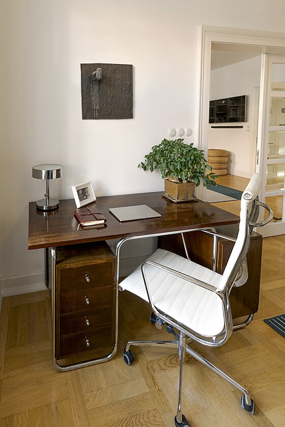 Sama ji navrhla i organizovala a k návrhu dodává: „Změnila jsem dispozici bytu, do níž jsem přidala samostatnou šatnu. Nechala jsem odstranit luxferové stěny. Jsou sice znovu v módě, ale do takového bytu se nehodí. Měla jsem jasnou představu o fungování dispozice, ale také o vybavení. Veškeré knihovny a vestavěné skříně v hale a šatně jsem nechala vyrobit na zakázku ve firmách Vondřich a Stako. Kuchyňskou linku jsem pořídila ´konfekční´ z IKEA. Originalitu jí dodal italský keramický obklad pokrývající celou stěnu i atypická digestoř Elica. Hlídala jsem detaily korespondující s historií bytu, kupříkladu porcelánové vypínače a zásuvky značky Berker ze série 1930.“