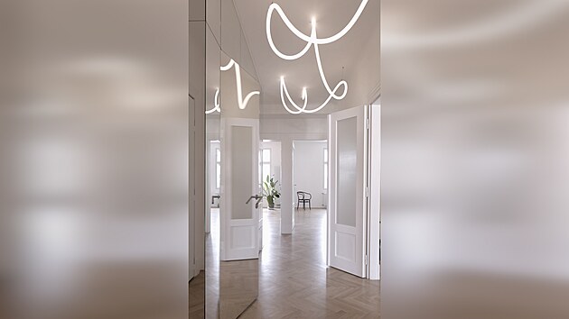 V koupelně a na soklu barového pultu je použitý plastický obloukový obklad navazující na reliéf původních kanelovaných zárubní. Zelená barva obkladu kuchyňského ostrůvku je doplněna komplementární červenou barvou lineárního osvětlení jako jediného dominantního prvku v bytě.