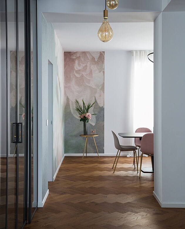 Interiéry jsou doplněny nábytkem vyrobeným na zakázku a květinovými tapetami, které vytvářejí jemnou a harmonickou atmosféru.