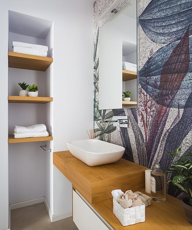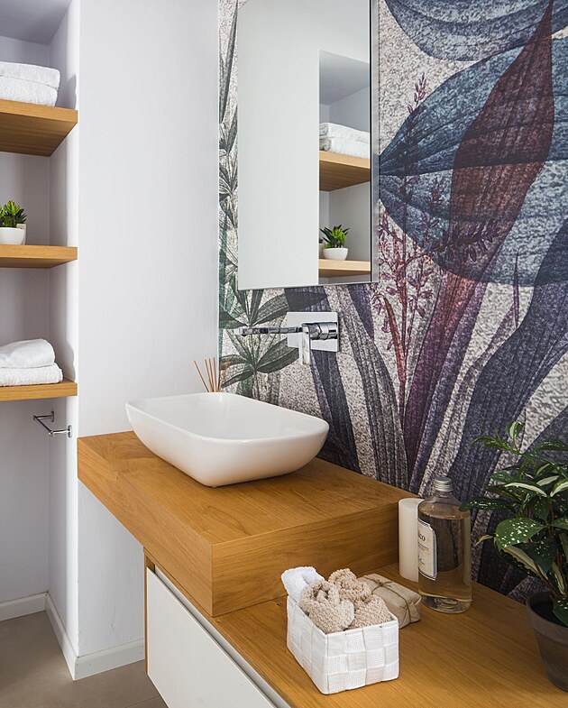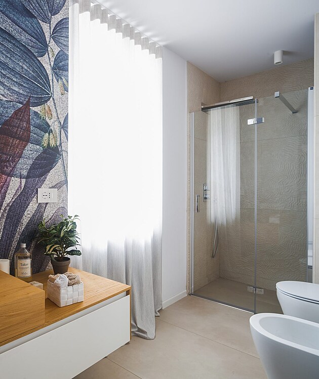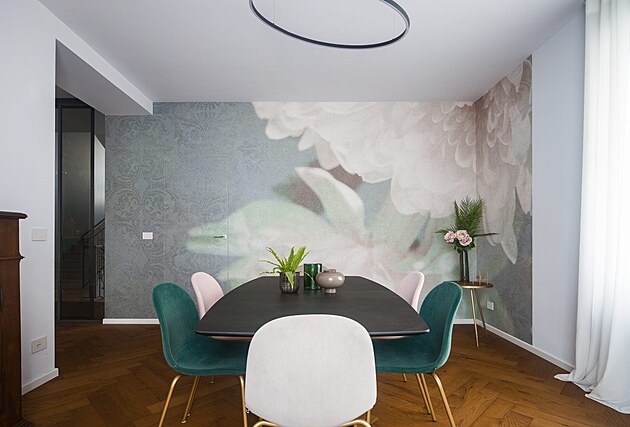 Interiéry jsou doplněny nábytkem vyrobeným na zakázku a květinovými tapetami.