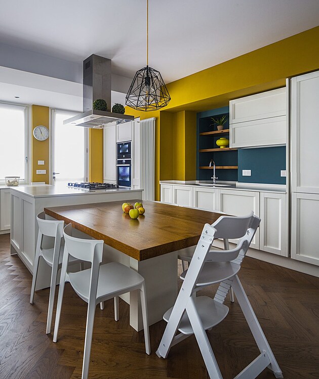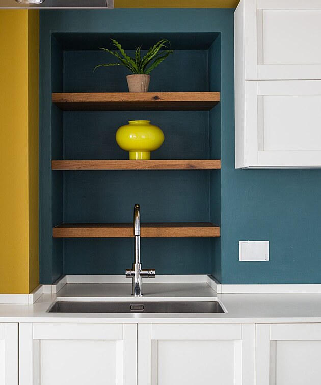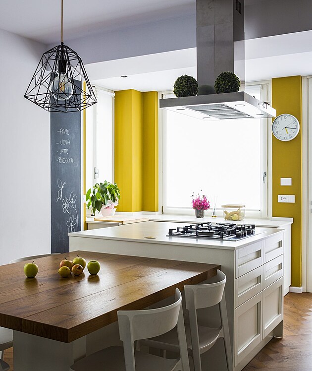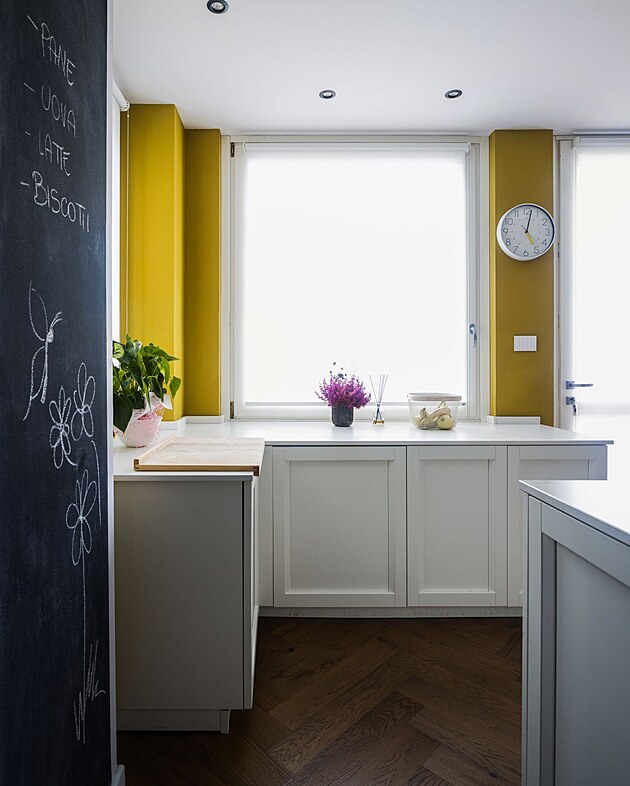 Světlou kuchyň opticky zatepluje výmalba v barvě hořčice.