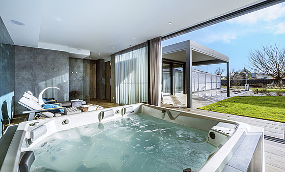 Hlavní dominantu interiérů wellness tvoří vířivka a obložení hlavní stěny velkoformátovou dlažbou Emerald v modrotyrkysové barvě, kterou doplňuje rovněž velkoformátová dlažba v šedém odstínu.