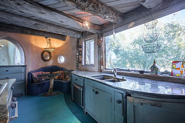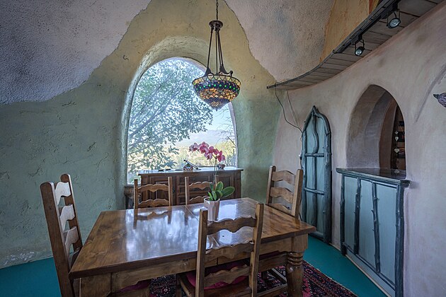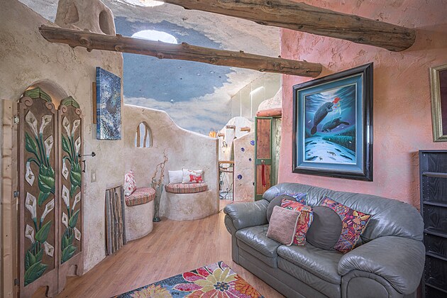 Netradiční nemovitost kombinuje barvy, dekorace a ručně malované nástěnné malby s okny ve tvaru půlměsíce.